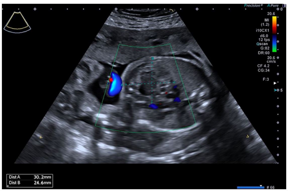 Management decisions in this case were made by a multidisciplinary team composed of obstetricians specializing in fetal diagnosis and therapy, neonatologists, pediatric cardiologists and surgeons, radiologists, and geneticists. A monitoring plan was established with biweekly US scans.
