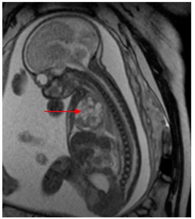 Fetal MRI at 29 weeks confirmed the suspected diagnosis of teratoma (Figure 2). Mild pleural effusion and ascites were noted, consistent with early signs of fetal hydrops.