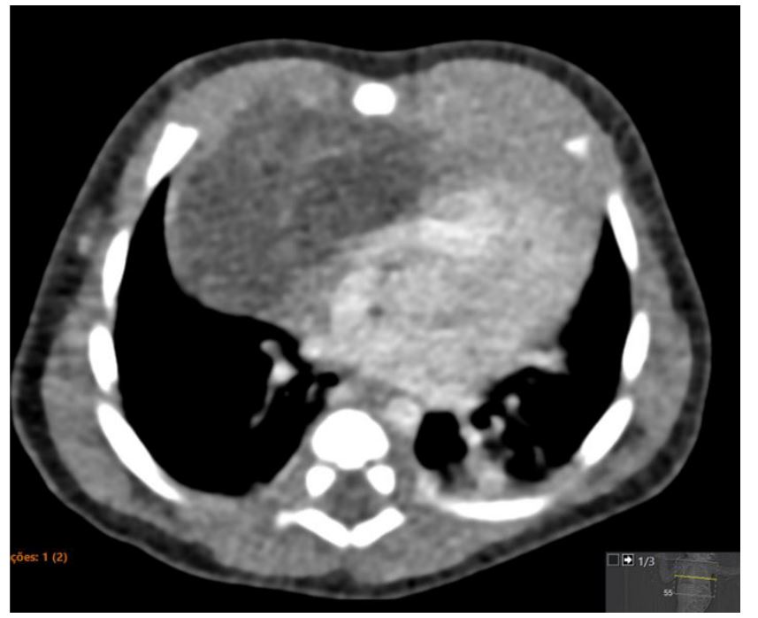 On day 7, a computed tomography (CT) scan of the chest showed a well-defined tumor measuring 60 x 54 x 32 mm, heterogeneous and with areas of calcification (Figure 4). It was closely associated with the mediastinal vessels and caused a mass effect in the thorax, although no pleural effusion was observed.