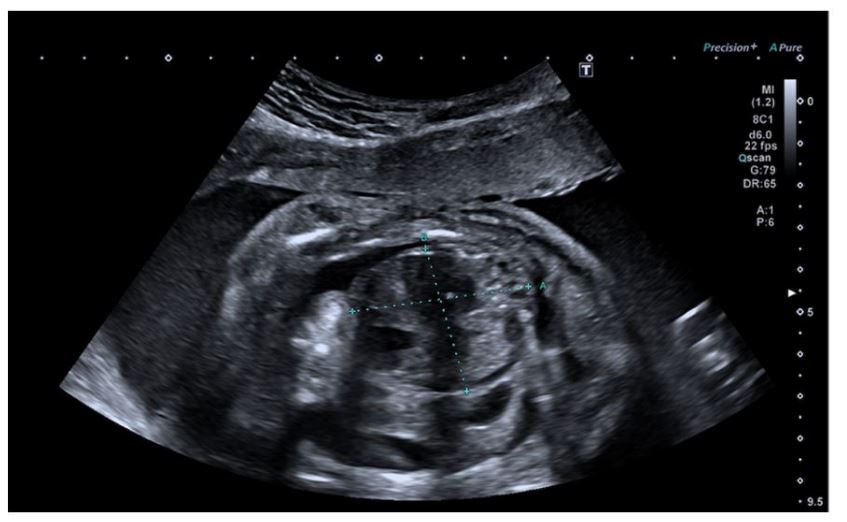 No additional findings were noted on fetal scans from 33 to 39 weeks. At 39 weeks, the patient experienced spontaneous rupture of membranes and a female infant weighing 2535 g was born by vacuum-assisted vaginal delivery. Apgar scores were nine at five minutes and 10 at 10 minutes, with no signs of respiratory distress.