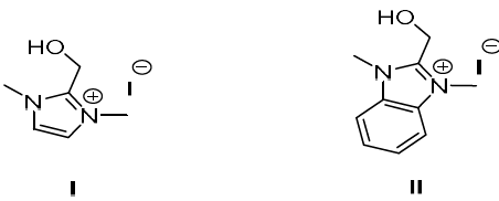 Compounds I and II were synthesized (Fig. 1), by treating one equivalent each of (1-methyl-1H-imidazol-2-yl) methanol and (1-methyl-1H-benzimidazol-2-yl) methanol, respectively, with 3 equivalents of methyl iodide in refluxing CH3CN. The white solids were filtered off, and then washed with CH3CN. Suitable crystals of the compounds I and II were obtained through aqueous and CH3CN/MeOH solutions evaporation, respectively. The X-ray crystallographic analysis of I and II single crystals confirmed their structures (Fig. 2).