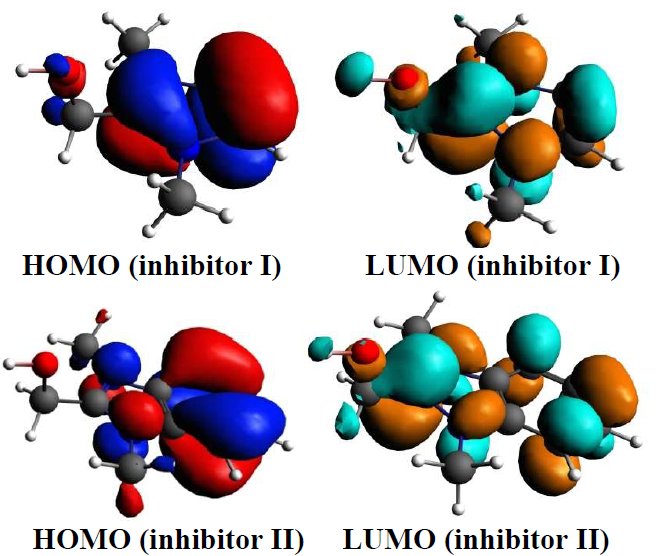 The quantum chemical parameters, such as EHOMO and ELUMO, ∆E and μ, have been determined for establishing possible relations between the structures of compounds I and II and their IE% (Table 5). The inhibitors optimized structures, HOMO and LUMO are shown in Fig. 10.