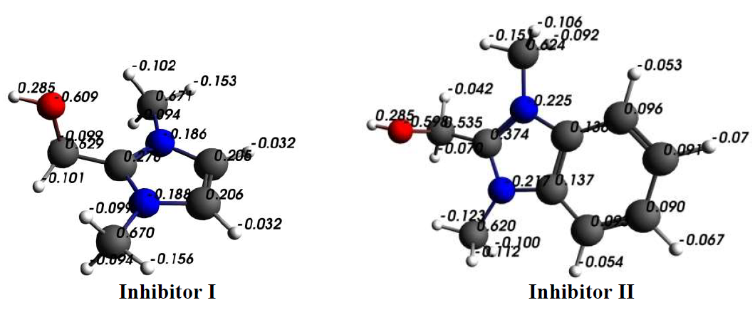 The comparison obtained from the Mulliken charges, on the optimized structure of both inhibitors atoms, shows that the active adsorptive O atoms were more negative (Fig. 11). So, these atoms acted as donors of electrons, and there was an electrostatic attraction between the MS surface and both inhibitor molecules.