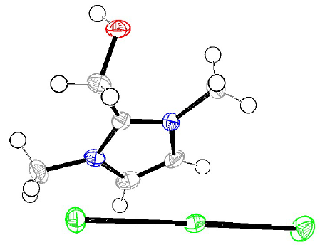 The isolated compound (dimOHmIm)+ I- 3asymmetric unit contains a 2-hydroxymethyl-1,3-dimethylimidazolium cation and a tri-iodide anion. This compound production is explained by the following equations: