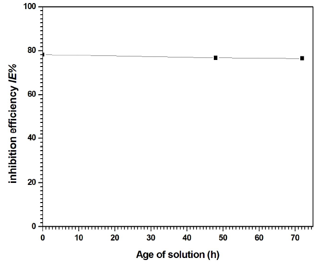 It is clear from Fig. 13 that, after 72 h, IE% did not significantly change (78.25 and 76.48%, for the freshly prepared and 72 h aged solutions, respectively).