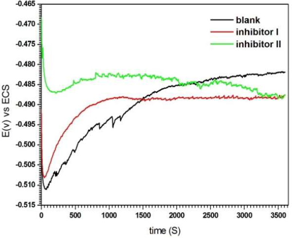 In the solutions with inhibitors, the steady state was achieved in about 10 min, while in the blank solution it was achieved in approxim. 30 min. The electrode E finally became stable, which suggests the accomplishment of the steady state, where a dynamic equilibrium exists between the corrosion product deposition on the MS surface and its dissolution. It should be noted that OCP has shifted to more negative values in the inhibitors presence (-488 mV vs. SC electrode).