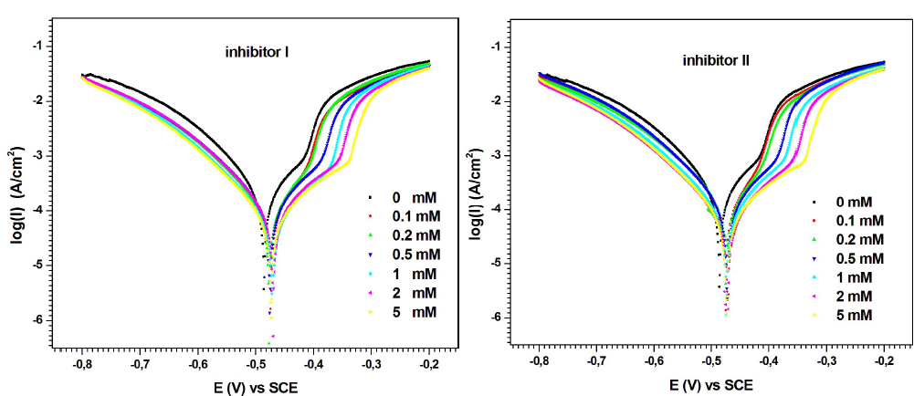 Table 2 shows that Icorr decreased with increased concentrations of compounds I and II. Its lower value was obtained at 5 mM of both inhibitors.