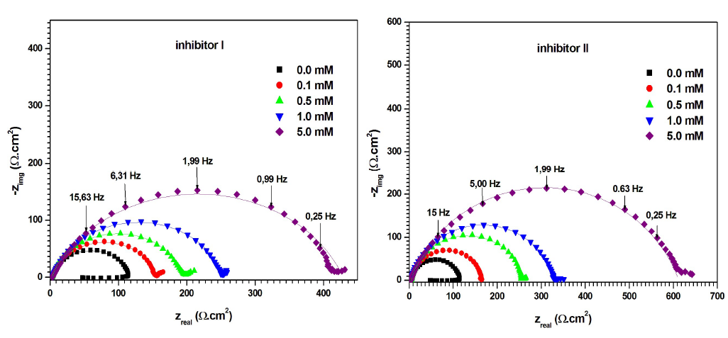 EIS recorded higher corrosion IE% for inhibitor II (81.4%) than that of I (73.2%), at their higher concentrations (5 mM), in 0.5 M H2SO4. These results are in good agreement with the ones obtained from PDP measurements.