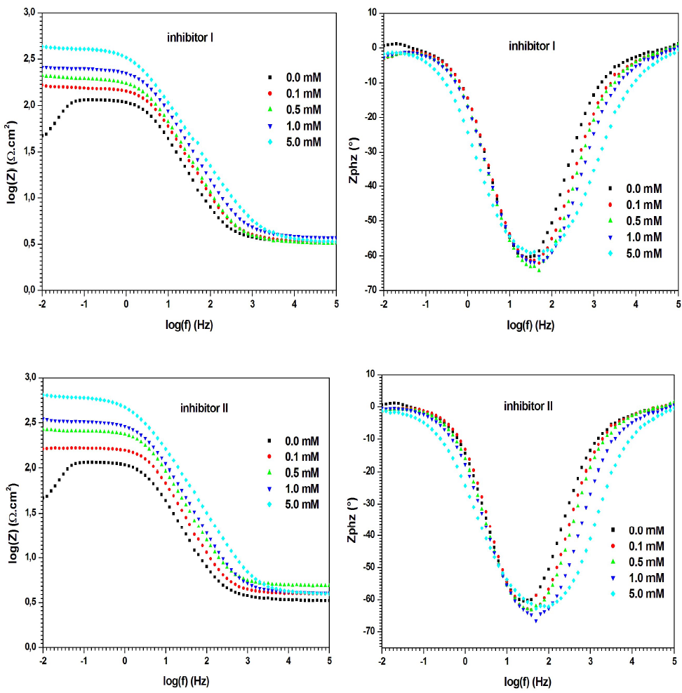 On the other hand, according to the Bode plots of the evaluated inhibitors (Fig. 7), Zmod rose when their concentrations increased, which indicates better IE% 46.