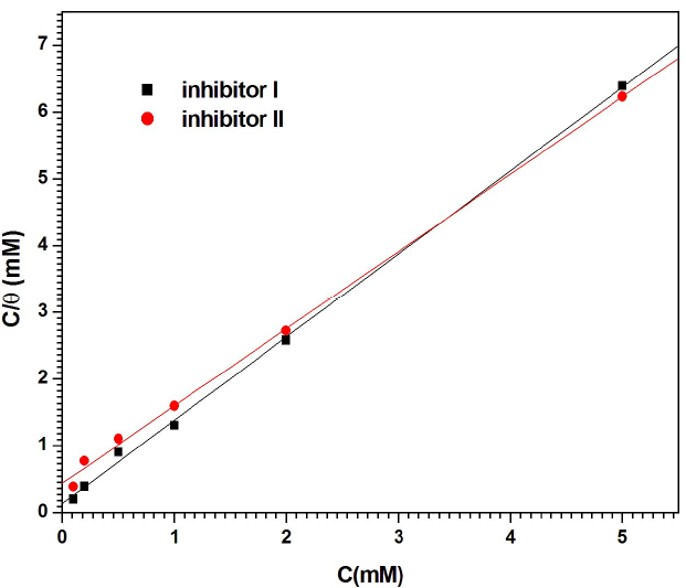 The K values were calculated from the straight lines intercepts with Cinh/θ axis, and are 7.604 × 103 and 2.295 × 103 M-1, for inhibitors I and II, respectively. These values reflect the formation of stable adsorbed inhibitors layers, and their strong interaction with the metal surface.