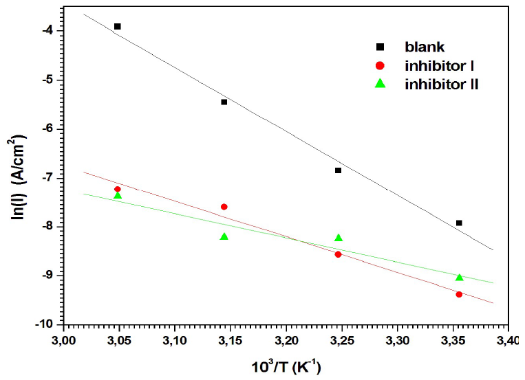 The temperature effect on corrosion electrochemical parameters was determined from 298 to 328 K, without and with 1 mM of compounds I and II in 0.5 M H2SO4, using PDP measurements. Ea for MS corrosion in 0.5 M H2SO4 without and with 1.0 mM inhibitors was calculated using Arrhenius equation: