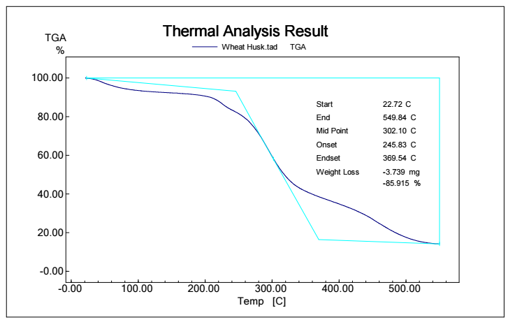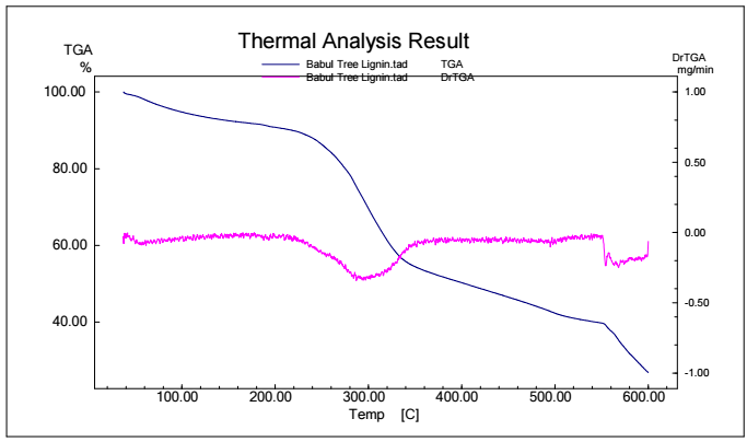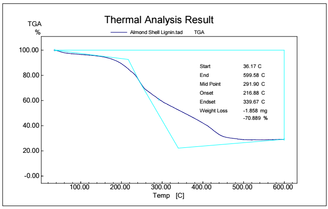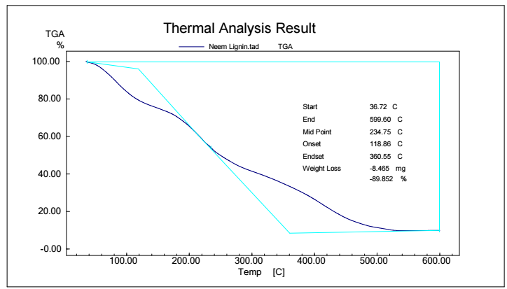 Figs. 5, 6, 7 and 8 show TGA analysis of Bm from AS, BTB, NTB and WS extracted Ln. As observed in Figs. 5 and 6, if the percentage change in sample mass decreased with an increase in T in a TGA curve plot, which typically indicates a process of sample mass loss or decomposition.