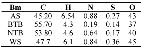 The raw material for BTB analysis had the highest Ct of C and the lowest S content. AS content of O was higher than that of BTB. While reducing N and S levels, acid washing may slightly increase Ct of C, H and O in Bm from Ln.