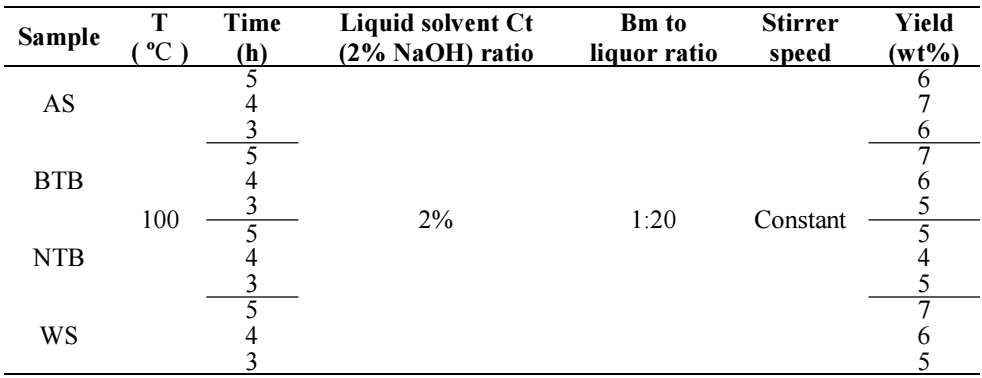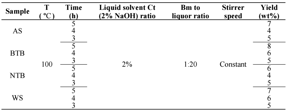 Tables 3 and 4 present results on Ln yield extraction for the different samples tests. For all four Bm samples, the time was 5, 4 and 3 h. T values were 100 and 160 ºC. Both Bm-to-liquor ratio and the liquid solvent Ct were held constant at 2% and 1:20, respectively. To investigate T effect on Ln extraction yield from Bm, experiments, showing the different liquor formulation used in the complete methodology of this work on LN extraction were conducted.