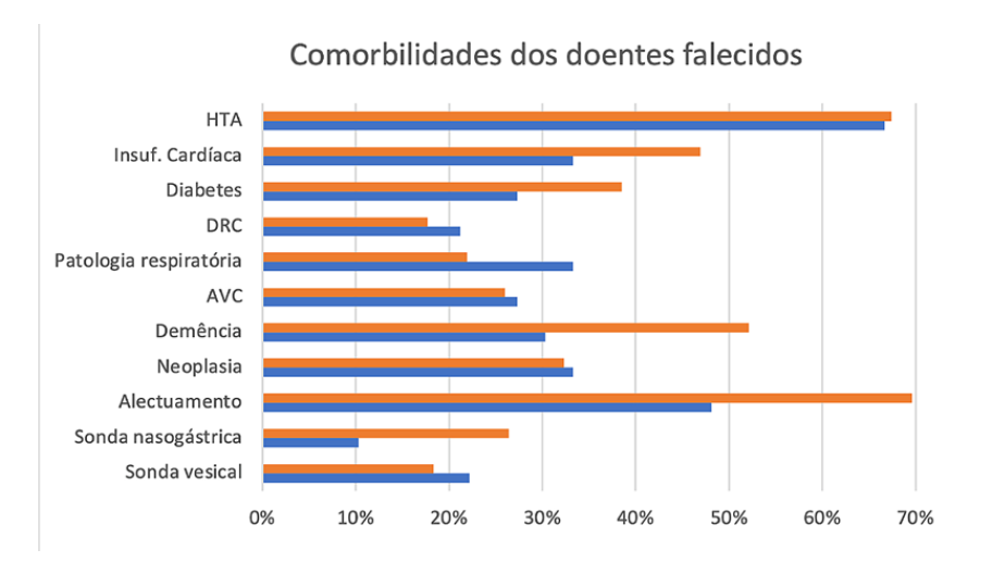 Quanto à presença de comorbilidades, comparando os anos de 2019 e 2020, não foram encontradas diferenças em relação à presença de HTA (66,7 % vs 67,4%, p = 0,94), diabetes mellitus (27,3% vs 38,5%, p = 0,24), insuficiência cardíaca (33,3% vs 46,9%, p = 0,18), DRC (21,2% vs 17,7%, p = 0,65), antecedentes de AVC (27,3% vs 26%, p = 0,89), antecedentes de neoplasia (33,3% vs 32,3%, p = 0,84), antecedentes de patologia respiratória (33,3% vs 21,9%, p = 0,19), ser portador de sonda vesical (22,2% vs 18,3, p = 0,15) e ser portador de sonda nasogástrica (10,7% vs 26,4%, p = 0,18) (Fig. 2).