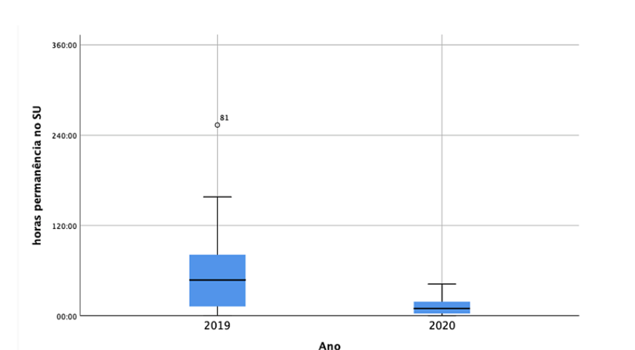 Quanto ao tempo de permanência no SU, ou seja, ao tempo decorrido entre a admissão do doente e o seu falecimento, verificou-se diferença significativa entre os dois grupos (p < 0.01), com tempo médio de permanência de 56h58 min (dp ±55h53) em 2019 e de 11h54 min (dp ±9H52) em 2020 (Fig. 3).