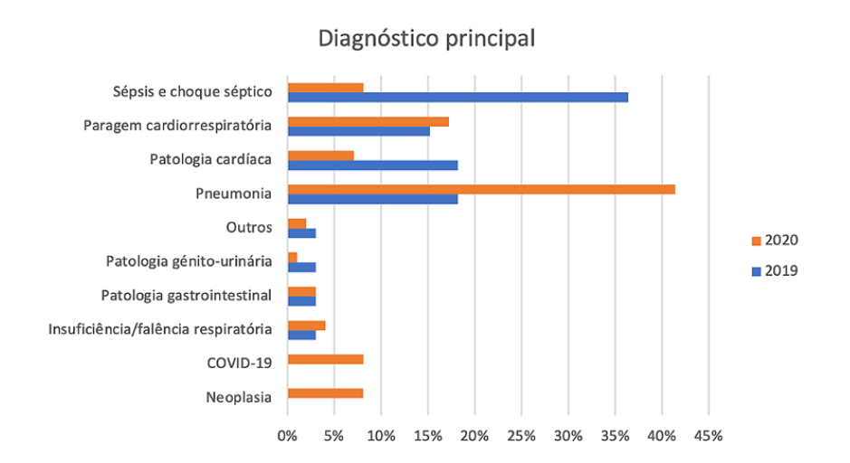 O diagnóstico mais prevalente em 2019 foi a sépsis e o choque séptico (36,4%), seguido das infeções respiratórias (18,2%) e doenças do foro cardiovascular (18,2%). Já em 2020 o diagnóstico mais frequente foi a infeção respiratória (41,4%), seguido de paragem cardiorrespiratória (17,2%) e neoplasia (8,1%), suspeita de infeção COVID-19 (8,2%) e sépsis e choque séptico (8,2%) (Fig. 4).