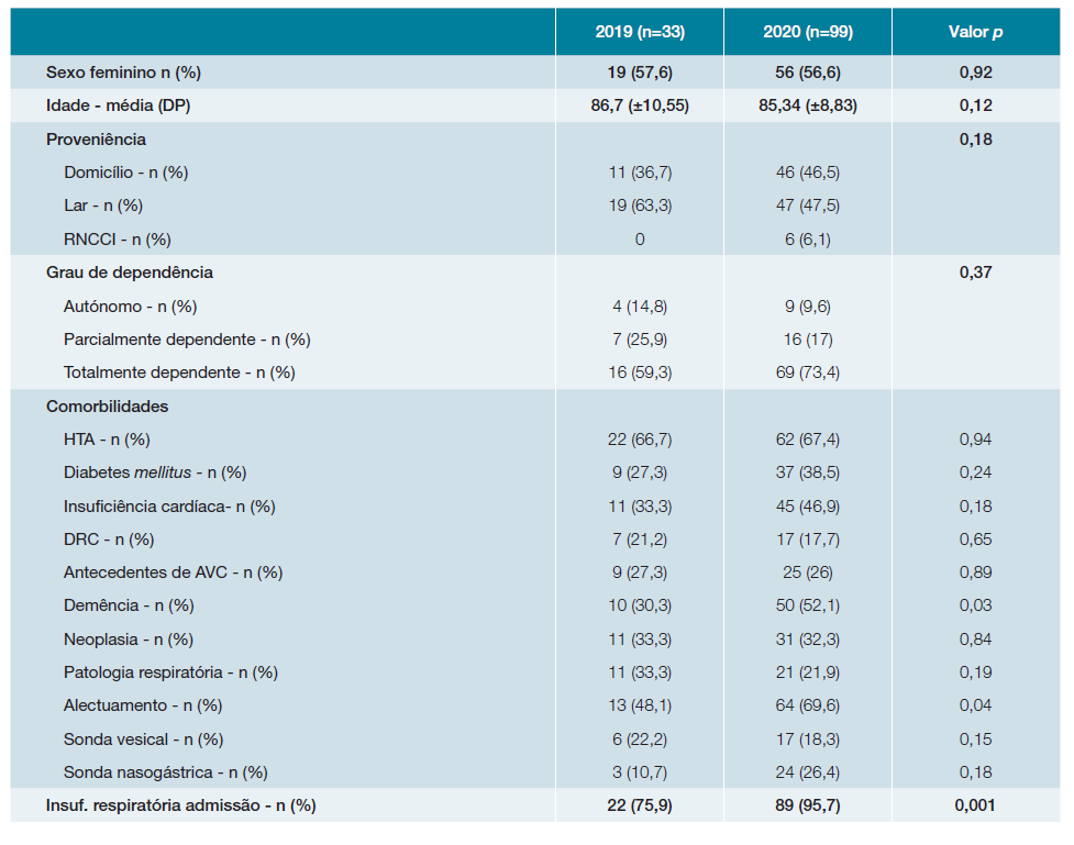 O teste qui-quadrado mostrou diferença entre os dois anos quanto à presença de demência (30,3% em 2019 vs 52,1% em 2020, p = 0,03) e alectuamento (48,1% em 2019 vs 69,6% em 2020, p = 0,04).
