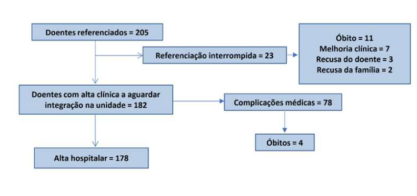 O período de tempo decorrido entre o momento de início do processo de referenciação pela ECL e a integração na RNCCI não foi considerado relevante para o desenvolvimento de intercorrência clínicas por ser curto e porque todos os doentes já estavam referenciados para a RNCCI no momento da alta clínica.