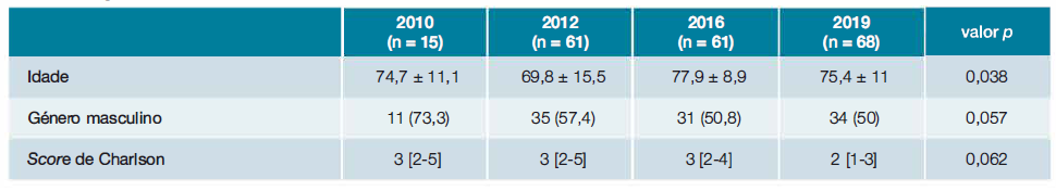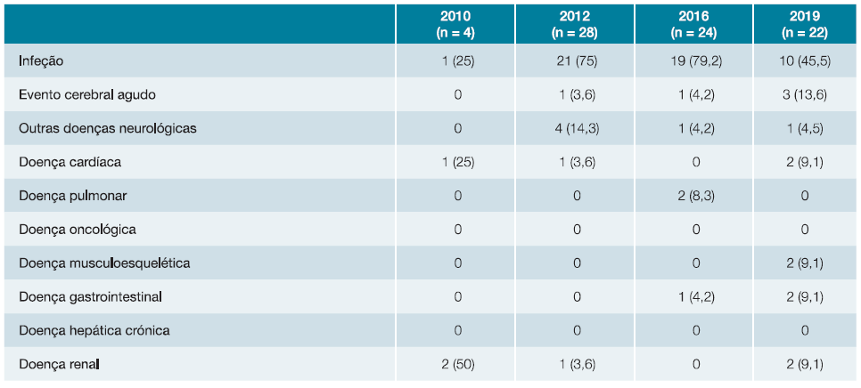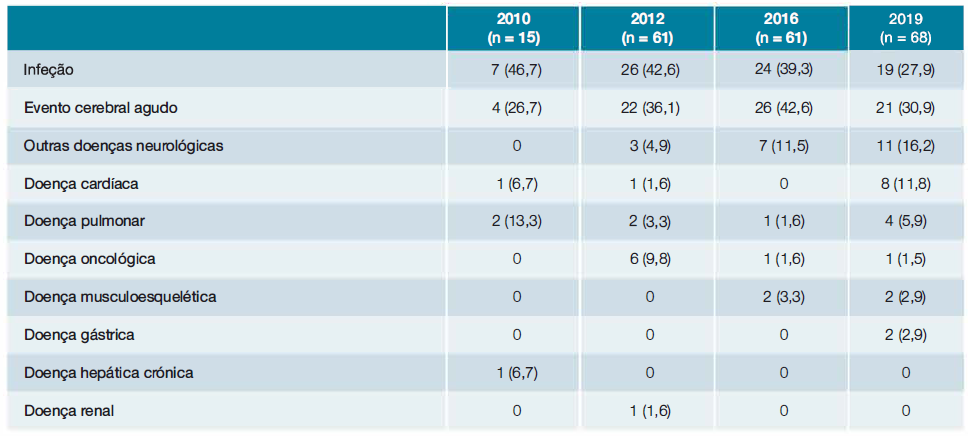 Os motivos de admissão hospitalar de todos os doentes incluídos foram maioritariamente infeção (37, 1 %, n = 76), evento cerebral agudo (35,6%, n = 73) e outras doenças neurológicas (10,2%, n = 21). Em 2010 e 2012 a infeção foi o motivo mais comum seguido do evento cerebral agudo, tendência que se inverteu em 2016 e em 2019, anos em que o evento cerebral agudo foi o motivo internamento mais frequente seguido de infeção, p = 0,08 (Tabela 2).