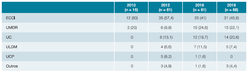 Relativamente à tipologia da unidade, foram realizadas no total 103 referenciações para a ECCI (50,2%), 39 para a UMDR (19%), 34 para a UC (16,6%), 16 para a ULDM (7,8%), 6 para a UCP (2,9%) e 7 (3,4%) para outros (maioritariamente ECSCP e unidades em hospitais privados). Em 2010, 2016 e 2019 as tipologias da unidade mais frequentemente solicitadas foram a ECCI e a UMDR e em 2012 foram a ECCI e a UC (Tabela 3).