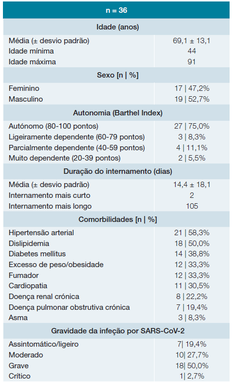 Desta amostra total inicial, 52,7% da coorte eram do sexo masculino (n = 19). A idade média foi de aproximadamente 69 anos, tendo a maioria a autonomia preservada (75,0%; n = 27). A hipertensão foi a comorbilidade mais frequente, relatada em 21 doentes (58,3%). Mais de metade da amostra apresentava COVID-19 grave (50,0%; n = 18) ou crítica (2,7%; n = 1), sendo significativa a proporção de doentes assintomáticos/ligeiros internados (19,4%; n = 7), concordante com a fase pandémica em que decorreu o estudo (Tabela 1).