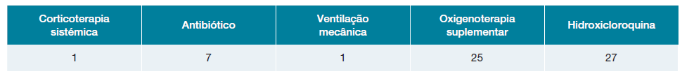 Da amostra total, 9 doentes não foram medicados com hidroxicloroquina durante o período de internamento (Tabela 2). Destes, 7 apresentaram doença ligeira pelo que não eram candidatos a essa terapêutica, à luz dos critérios vigentes na altura. Os restantes dois tinham risco aumentado de iatrogenia, um pela presença de alterações eletrocardiográficas (QTc longo) e outro caso pela agudização de doença renal crónica com maior risco de nefrotoxicidade. O doente que realizou corticoterapia sistémica foi por exacerbação da asma no contexto da infeção por COVID-19. O doente que recebeu ventilação mecânica acabou por perder seguimento por abandono das consultas de seguimento.