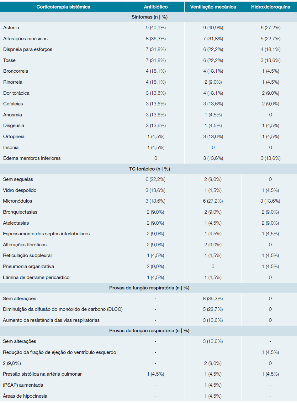 Os dados clínicos durante o acompanhamento foram recolhidos em consulta presencial por um dos médicos investigadores, através de uma entrevista clínica. Foi considerada a presença ou ausência dos sintomas analisados. Relativamente as alterações imagiológicas, foram consideradas pela presença ou ausência da sua descrição no relatório radiológico. Não foi feita análise por scores imagiológicos padronizados, na altura não existentes.