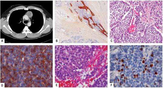 Fig. 1 – A: corte da TACt pré-operatória; B: caracterização da localização intratímica da neoplasia pela CK 19 e negatividade das células neoplásicas, CK19 X 40; C: padrões trabecular e sólido, HE X 100; D: marcação granular da cromogranina citoplasmática (TTF-1 negativa), cromogranina X 200; E: mitose visível, HE X 200; F: índice proliferativo superior a 10%, Ki 67 X 200