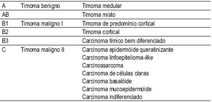Em 1999, a Organização Mundial de Saúde (OMS) actualizou a classificação dos tumores do timo. A classificação dos timomas baseia-se na avaliação histológica da componente neoplásica epitelial e quantidade relativa do componente linfocítico não neoplásico15 (Quadro I), sendo a sua aplicação consensual. Foi mantida na edição de 20042-4.