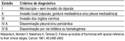 Os tumores tímicos podem ser estadiados por vários sistemas, nomeadamente pelo sistema TNM ou pelos critérios de Masaoka. O sistema de Masaoka5 (Quadro II) corresponde a uma classificação histoclínica com base no grau de invasão local e à distância12 e é mais utilizada do que o estadiamento TNM.