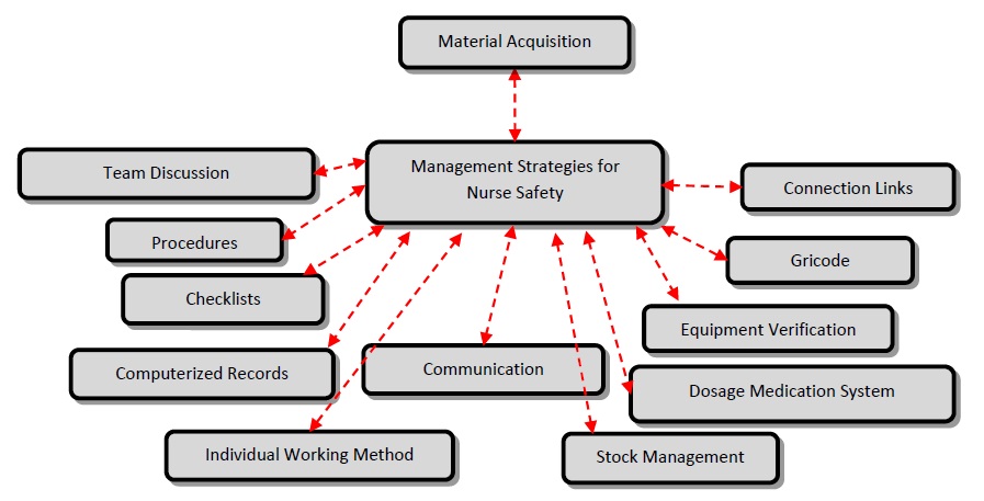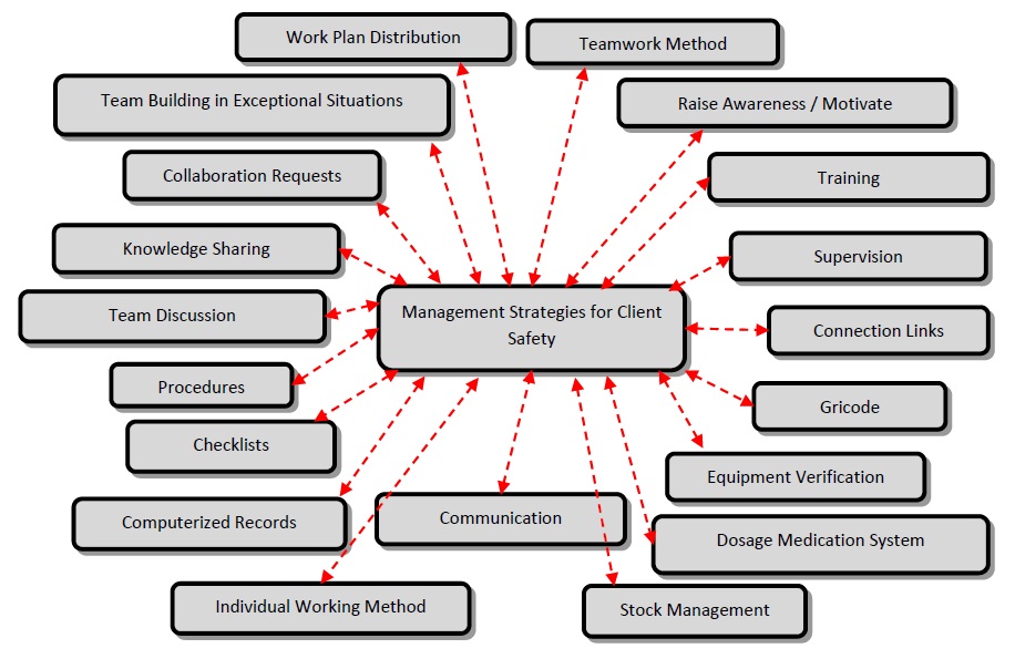 Of the nineteen categories in client safety management strategies, nine were uniquely identified for the client: Checklists, Communication, Stock Management, Unit-dose Medication System, Gricode® system, Procedures, Individual Working Method, Equipment Verification and Computerized Records (Figure 1).