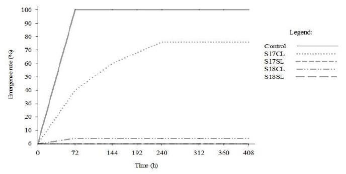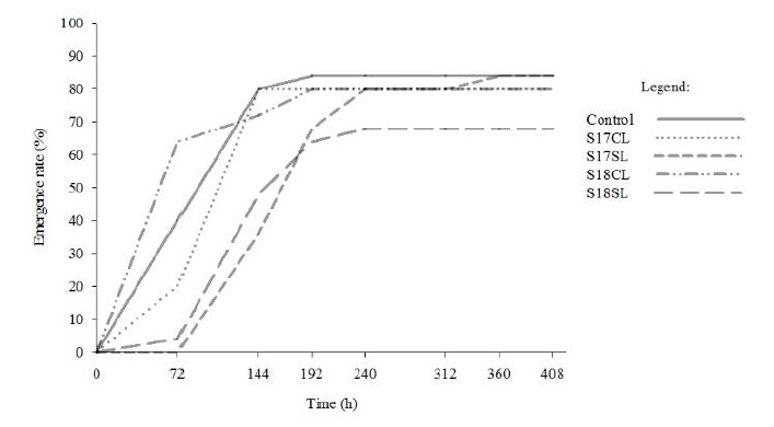 The time for emergence rate stabilization in the control was 72 h. The S17CL was very different from the control, it was needed 240 h to stabilize, and the emergence was spaced between seeds.