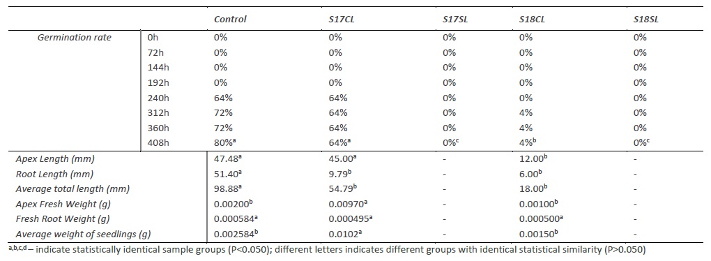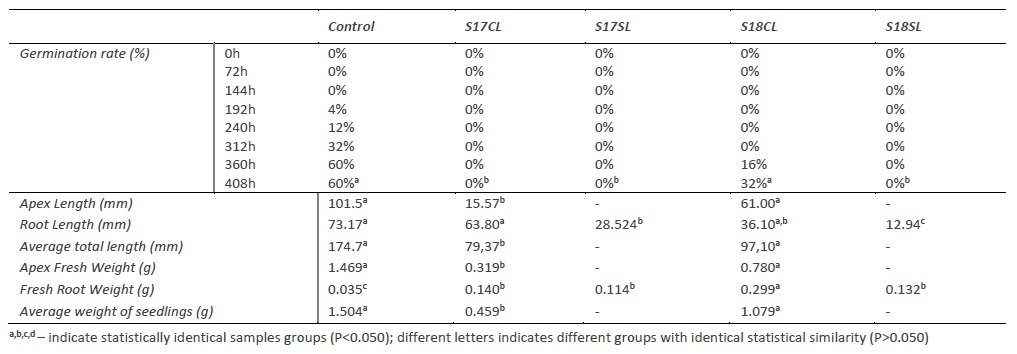 The statistical analysis of the final emergence rate gave differences between the samples and control, apart from the S17CL (p= 0,803). With the time as variable, at statistical level there were differences between all the samples and the control, with the S17CL having the statistical threshold that reveal to be identical to the control (P= 0,11) and the rest of the samples with the control is statistically very different from the other samples analyzed (P<0,001).