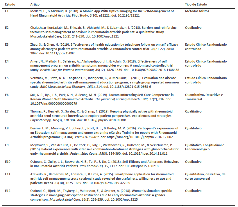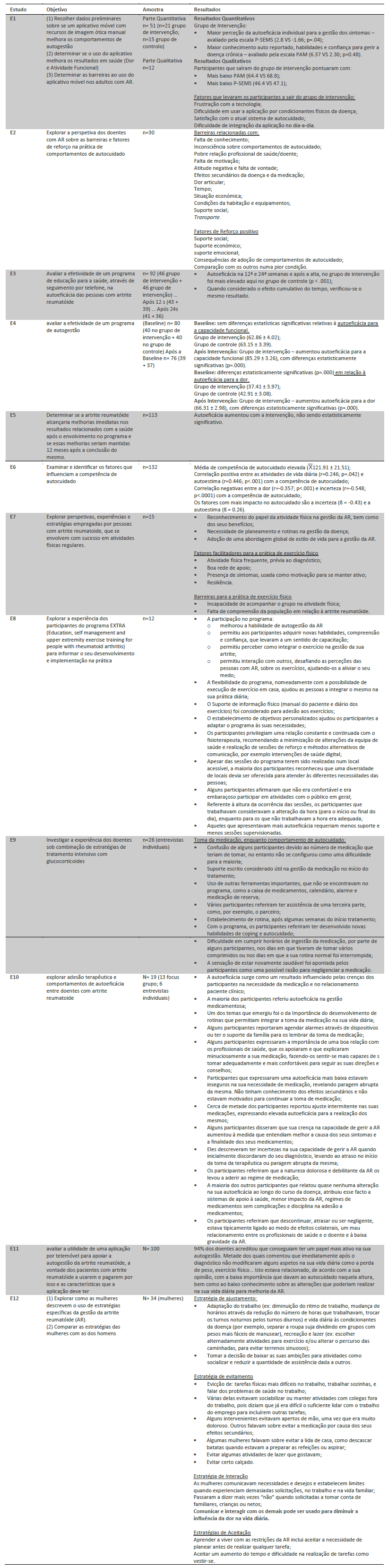 Destes destacamos os fatores relacionados com o conhecimento, identificado em 9 dos 12 estudos, congruente com as recomendações da EULAR para a gestão da AR, em que enfatiza a importância do papel da educação para a saúde (Smolen et al., 2020; Zangi et al., 2015).