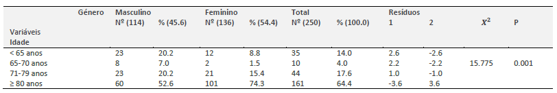 O presente estudo obteve uma amostra de 250 pessoas, com uma idade mínima de 27 anos e máxima de 101 anos, com 64,4% (n=161) dos falecimentos a corresponderem a pessoas com idade igual ou superior a 80 anos e 17,6% (n=44) com idade compreendida entre os 71-79 anos representa 17,6% do total da amostra (Tabela 1).