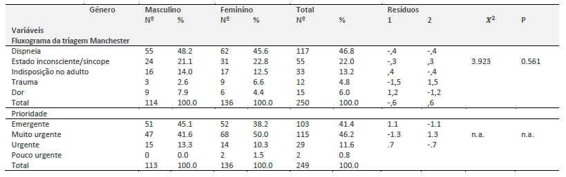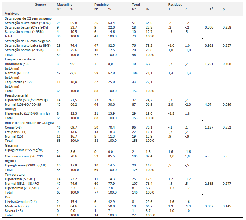 Variáveis clínicas relativas à saúde foram também objeto de análise da nossa investigação. Verificou-se que 64,6% (n=51) da amostra em estudo apresentou saturações periféricas de oxigénio, sem O2 suplementar, inferiores a 89%, contudo, cerca de 79,2% (n=76) da amostra total apresentou valores inferiores a 94% com administração de oxigenoterapia. Uma percentagem significativa dos doentes incluídos na amostra (28,8%; n=43) apresentava valores anormais de frequência cardíaca, com 6,7% (n=10) por bradicardia (FC<61 bpm) e 22.1% (n=33) por taquicardia (FC>119 bpm). A variável de saúde referente à pressão arterial, na amostra em estudo, permitiu verificar que 56,9% (n=87) apresentou valores normais (139-90/60-89 mmHg). Perante o índice de reatividade de Glasgow o que apresentou maior representatividade foi o estado de coma, com 70,1% (n=96) dos casos em estudo. Os valores de glicemia capilar, avaliados na amostra em estudo, permitiu verificar que a maioria dos doentes que acabaram por falecer registava valores normais (56-299 mg/dl), com uma representatividade de 82,4% (n=103). Perante a variável de saúde da temperatura corporal, foi possível constatar que 17,9% (n=25) dos doentes apresentava-se com hipotermia (TºC<35.1ºC). Importa ainda salientar que os resultados obtidos com esta investigação, mostram que 70,4% dos doentes que acabaram por falecer no serviço de urgência em estudo apresentavam dor superior a 4 na Escala Numérica da dor. Os dados encontrados não permitem encontrara diferenças estatísticas significativas entres pessoas do género feminino e masculino (Tabela 3).