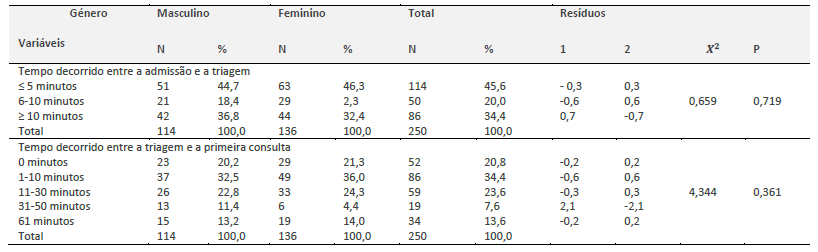 O estudo realizado permitiu constatar que 45,6% (n=114) das pessoas que faleceram no serviço de urgência, esperou menos de 5 minutos até ser triado, após a inscrição de episódio de urgência. Por outro lado 34,4% (n=86) esperou mais de 10 minutos. O tempo decorrido entre a triagem e a primeira avaliação médica apresentou valores igualmente importantes, já que 34,4% (n=86) da amostra em estudo esperou entre 1-10 minutos e 23,6% (n=59) esperou entre 11 a 30 minutos. Ainda assim, 20,8% (n=52) teve atendimento imediato. Os resultados, ainda assim, não demonstraram diferenças estatisticamente significativas quando comparados entre homens e mulheres (tabela 4).