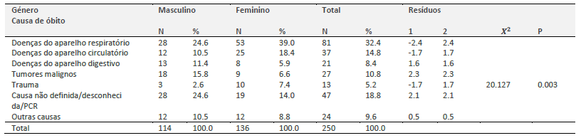 As causas do óbito mais prevalecentes foram as doenças do aparelho respiratório (32.4%; n=81), com 34.6% dos homens e 65.4% das mulheres, seguindo-se a causa não definida/desconhecida/PCR (18.8%; n=47; homens=59.6% vs. Mulheres=40.4%). Há ainda a referir que 14.8% (n=37) das pessoas faleceram por doenças do aparelho circulatório (homens=32.4% vs. Mulheres=67.6%). As diferenças encontradas são estatisticamente significativas (X2=20,187; p=0,003), situadas entre as pessoas falecidas do género feminino com causa de óbito as doenças do aparelho respiratório, e os falecidos do género masculino, cuja causa de óbito foram os tumores malignos e a causa não definida/desconhecida/PCR (Tabela 5).