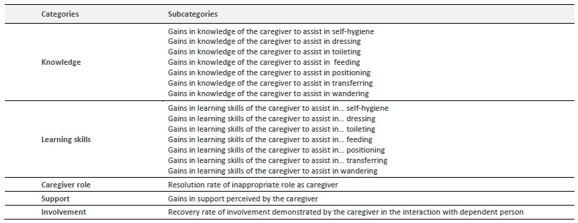 Scientific evidence points towards the preparation of the caregiver to play their role through knowledge and learning skills of the areas inherent to the satisfaction of the dependent person's needs. It has been referenced indicators as gains in knowledge and learning skills by the caregiver. This type of indicators provide guidelines to nurses for the promotion of the caregiver adaptation to the new role, especially in what concerns to the “know and know-how” giving and adequate response to their needs (Petronilho, 2008).