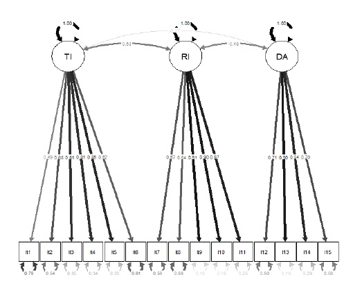 Of the three dimensions of the scale, only IE and IR, which are positively correlated with correlations of moderate intensity and statistically significant (p<0.001). The correlation between the DA and IE dimension is negative and negligible, i.e., only statistically significant at the 5% level (p = 0.044) and the correlation between DA and IR is moderately negative and statistically significant (p < 0.001). The negative relationships are due to the way in which DA issues are formulated in relation to IE and IR issues.