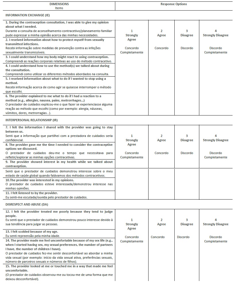 The modified QCC-PT scale consists of 15 items and three dimensions: Information Exchange (IE), with six items; Interpersonal Relationships (IR), with five items; and Disrespect and Abuse (DA), with four items. The IE dimension reflects the information that women are given about contraceptive methods and follow-up options, as well as the information they share with healthcare professionals about their preferences and needs. The IR dimension covers items related to privacy, confidentiality, respect, trust and empathy and the DA dimension includes the way health professionals treat women, discrimination and physical abuse (Table 1).