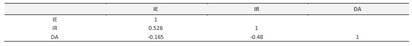The correlations between IE and IR and between DA and IR are of medium magnitude and the correlation between DA and IE is negligible, as shown in table 4.