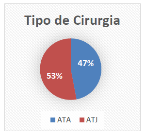 O tratamento dos dados obtidos pela aplicação do questionário de satisfação SNQ-10 a 85 doentes, apurou 37% do sexo masculino e 63% do sexo feminino (gráfico 1), com uma média de idade de 68,9 ± 9,4 anos. Relativamente ao tipo de cirurgia efetuada, 53% foram submetidos a ATJ, e os restantes a ATA (gráfico 2).