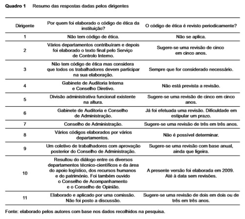 Por outro lado, no quadro 1 também é possível observar facilmente que a maioria dos dirigentes consultados considera o curto ou médio prazo como horizonte temporal razoável para proceder à revisão dos respetivos códigos de ética.