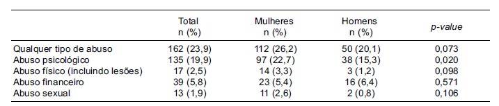 Relativamente à experiência de abusos no estudo quantitativo, 23,9% (n = 162) dos participantes reportaram terem sido vítimas de qualquer tipo de abuso, destacando-se as mulheres com uma prevalência de 26,2% (n = 112) e os homens com 20,1% (n = 50). As mulheres destacam-se em todos os tipos de abuso, em particular no abuso psicológico (22,7%). Embora em menor proporção, este tipo de abuso também é infligido sobre os homens (15,3%), seguido do abuso financeiro (6,4%) (quadro 1).