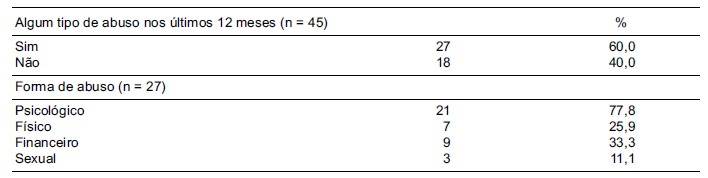 Dos 45 participantes nas entrevistas, 60,0% reportaram terem tido experiência de vitimização por tipo de abuso nos últimos 12 meses, para 40,0% que não reportaram experiência de vitimização. No universo dos que disseram ter tido experiência de abuso (n = 27), destaca-se, de novo, a ocorrência do abuso psicológico (77,8%), seguido da exploração financeira (33,3%) (quadro 2).