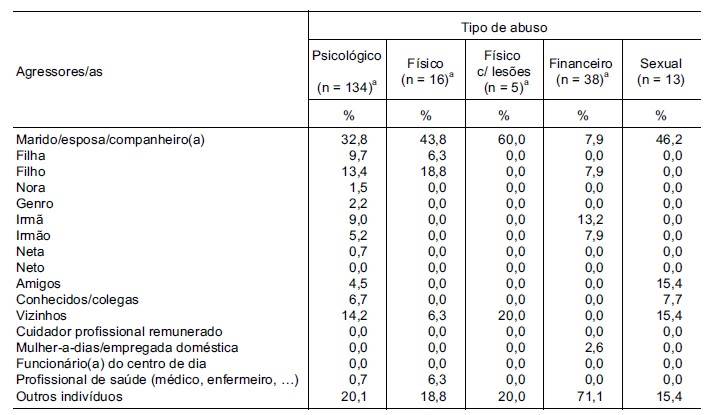 No nosso estudo, também é evidente que os abusos variam em função do tipo de relação entre a vítima e o ofensor, designadamente os cônjuges, os filhos, irmãos e genros surgem como os perpetradores de abuso físico, psicológico e financeiro. As filhas das vítimas, as irmãs e as noras infligem-lhes sobretudo abuso psicológico, físico e financeiro. Os amigos, os vizinhos, conhecidos e colegas infligem abuso sexual e as empregadas domésticas surgem como praticantes de abuso financeiro. Na mesma linha, os estudos, por exemplo, de O’Keeffe e outros (2007), Acierno e outros (2010) e Laumann, Leitsch, e Waite (2008) referem que os perpetradores de abuso físico, psicológico e verbal são sobretudo os cônjuges e outros familiares. Já o abuso financeiro, é praticado, de acordo com Lowenstein (2009), quer por familiares (por exemplo, filhos, netos, irmãos), quer pelos cuidadores informais e formais, os quais praticam igualmente negligência (Mysyuk, Westendorp e Lindenberg, 2016; Lemos e outros, 2022). A investigação presente na literatura corrobora, de igual modo, o nosso resultado para a ocorrência de abuso sexual que é praticado pelos parceiros íntimos, conhecidos (e.g., amigos, vizinhos e colegas) ou por pessoas completamente desconhecidas das vítimas (Acierno e outros, 2010; Amstadter e outros, 2010).
