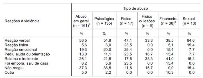 No quadro 4 apresentamos as reações dos participantes no inquérito às situações de abuso. A reação verbal ao abuso é a resposta mais comum dos inquiridos ao abuso em geral (56,5%), mas também em todos os tipos de abuso. A percentagem dos que referiram que simplesmente não reagiram à situação de violência é superior (37,3%) àqueles que decidiram denunciar (26,1%). É também nas vítimas de abuso psicológico que se encontram mais inquiridos que não reagiram a este tipo de violência (38,8%). Já as vítimas de abuso financeiro são as que relatam mais o incidente (41,0%). Por seu turno, as vítimas de abuso físico para além da reação verbal (47,1%), emocional e física, pedem mais ajuda e saem de casa, em comparação com as vítimas dos restantes tipos de abusos.
