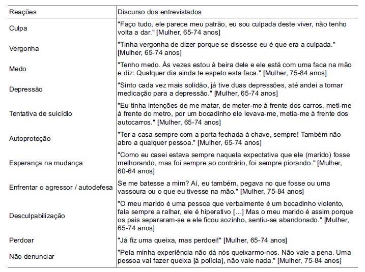 O quadro 5 mostra que entre as vítimas idosas estão presentes as reações e sentimentos que frequentemente encontramos nas vítimas com menos idade, em geral. A culpa, o medo, vergonha, problemas de saúde mental, ideias suicidárias, desculpabilização do agressor e esperança na mudança do seu comportamento, perdoar e não denunciar são as atitudes desenvolvidas pelas entrevistadas para gerirem as situações de violência. O enfrentamento do agressor nesta fase da vida continua a ser menos comum.
